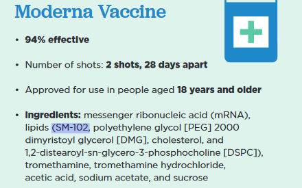 Ingredients: messenger ribonucleic acid (mRNA), lipids (SM-102, polyethylene glycol [PEG] 2000 dimyristoyl glycerol [DMG], cholesterol, and 1,2-distearoyl-sn-glycero-3-phosphocholine [DSPC]), tromethamine, tromethamine hydrochloride, acetic acid, sodium acetate, and sucrose • Explanation of ingredients: -... Read more »Published: May 11, 2022 - 7:34 am