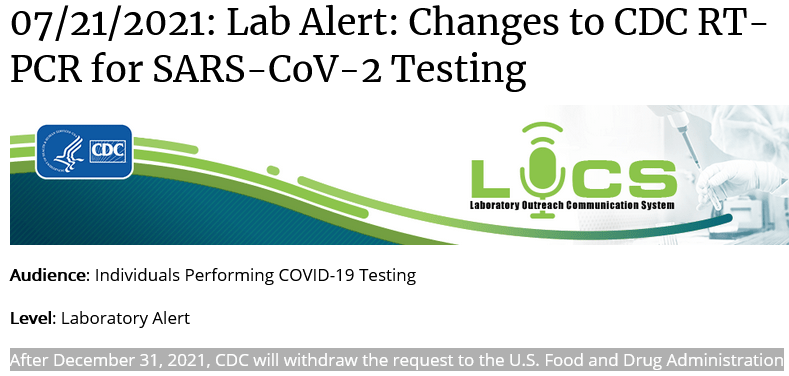 07/21/2021: Lab Alert: Changes to CDC RT-PCR for SARS-CoV-2 Testing